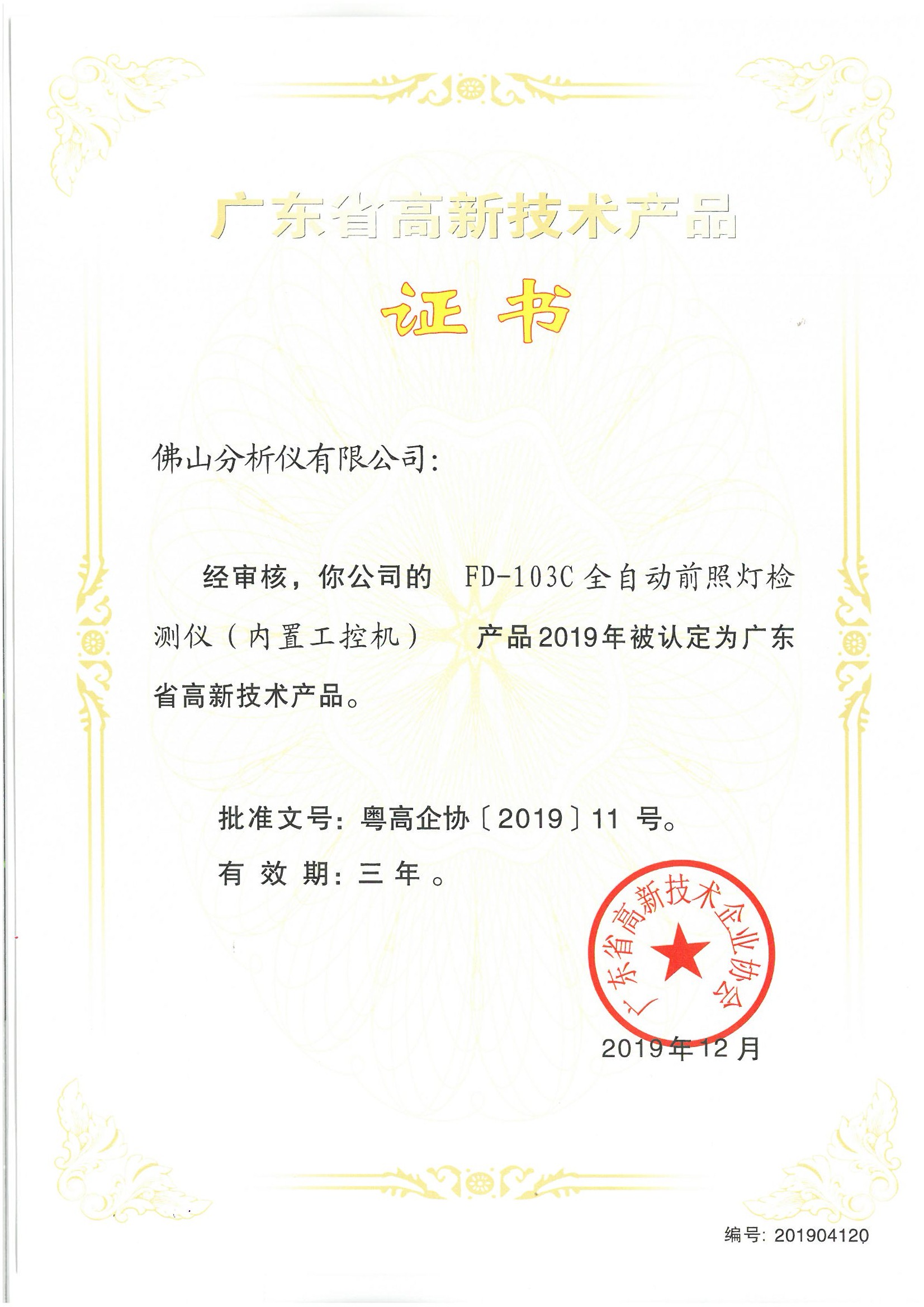 高新技術(shù)產(chǎn)品證書(FD-103C全自動(dòng)前照燈檢測(cè)儀(內(nèi)置工控機(jī)))